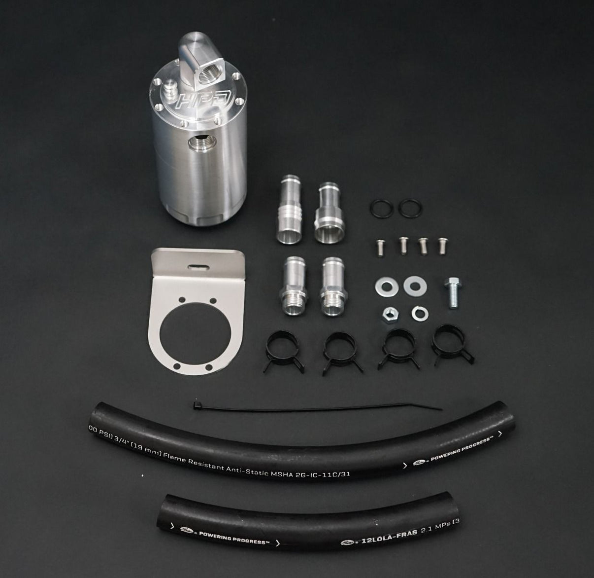 HPD’s oil catch can / oil separators come in universal and complete kits with all required stainless steel laser cut bracketry, correct size hose tail fitting, washable internal stainless mesh filters, cut to size oil resistant hosing, bolts, nuts, washer, spring clamps and installation instructions for each vehicle.