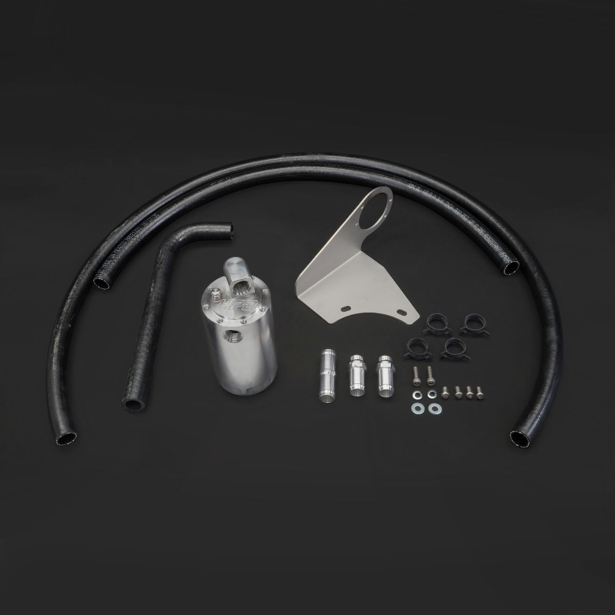 HPD’s oil catch can / oil separators come in universal and complete kits with all required stainless steel laser cut bracketry, correct size hose tail fitting, washable internal stainless mesh filters, cut to size oil resistant hosing, bolts, nuts, washer, spring clamps and installation instructions for each vehicle.