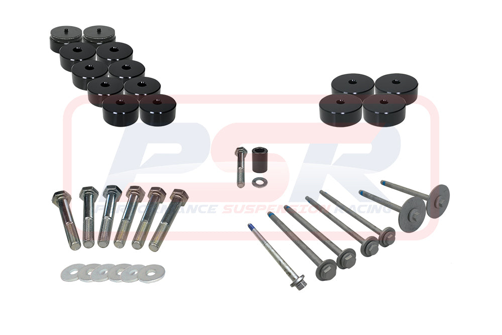 PSR offers a complete bolt-in 1" body lift kit for a dual cab variation with a tub. Kit is supplied with high tensile bolts and blocks to the size or larger than OE body mounts to be compliant. Blocks are machined from 6061 T6 Alloy block and anodized black. Also available to add on is our PSRRAN-086 Ford Ranger Next Gen 1" Rear Bar Lift Kit (Suits OE bar only)