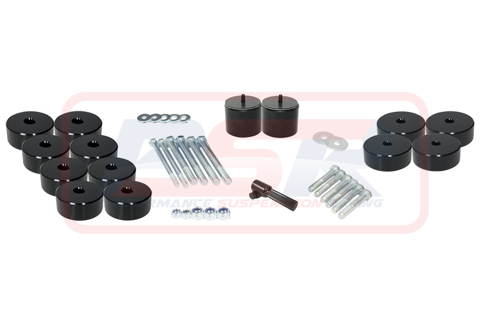 PSR offers a complete bolt-in 1" body lift kit for a dual cab variation with a tub. Kit is supplied with high tensile bolts and blocks to the size or larger than OE body mounts to be compliant. Kit comes with a bolt in steering column extension. Kit is complete with no additional items to purchase to body lift your Isuzu D-Max 3 / Mazda BT-50 TF 2021-ON. Blocks are machined from 6061 T6 Alloy block and anodized black.