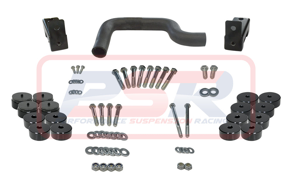 PSR offers a complete bolt-in 1" body lift kit for a single or space cab variation with a tub. Kit is supplied with high tensile bolts and blocks to the size or larger than OE body mounts to be compliant. Kit is complete with no additional items to purchase to body lift your Mazda BT50 or Ford PK Ranger. Blocks are machined from 6061 T6 Alloy block and anodized black.