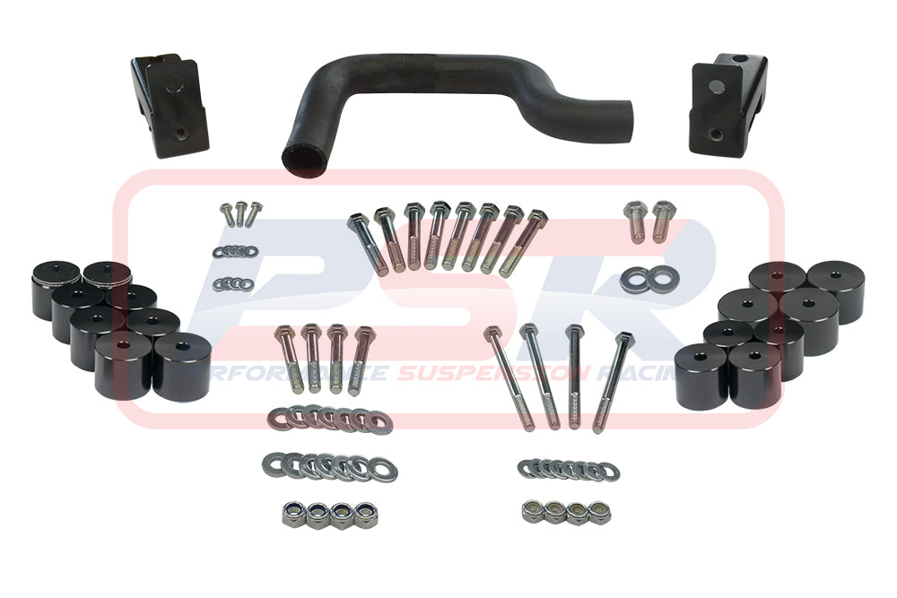 PSR offers a complete bolt-in 2" body lift kit for a dual cab variation with a tub. Kit is supplied with high tensile bolts and blocks to the size or larger than OE body mounts to be compliant. Kit is complete with no additional items to purchase to body lift your Mazda BT50 / PK Ranger. Blocks are machined from 6061 T6 Alloy block and anodized black.