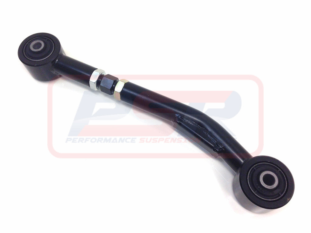 PSR's Nissan Patrol GQ-GU rear upper arm bent to suit long range fuel tanks now comes on car adjustable. When fitting a long range fuel tank under suspension travel the arm can come into contact with the tank. Due to space restrictions the tank must be placed in this position. This arm overcomes this issue while allowing adjustment to suit opposing arm. Supplied with new rubber bushes and coated Black to blend with the chassis.