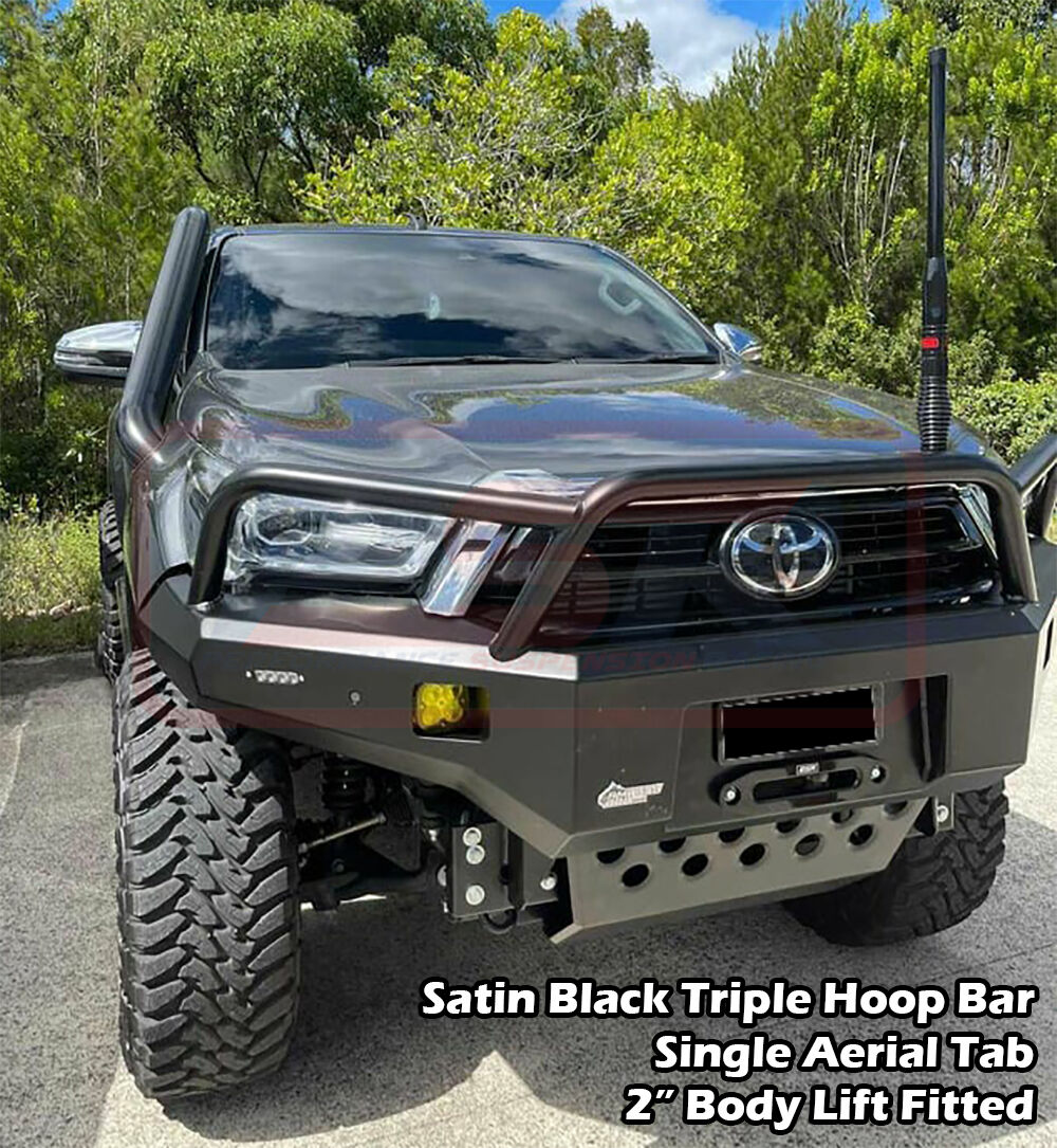 Hilux N80 MK3 5/20-On Ambush Customer Painted Triple Hoop Bar, Infill (2" Body Lift), Splash Guards, Slimline Silver Fairlead, Sensors, Camera