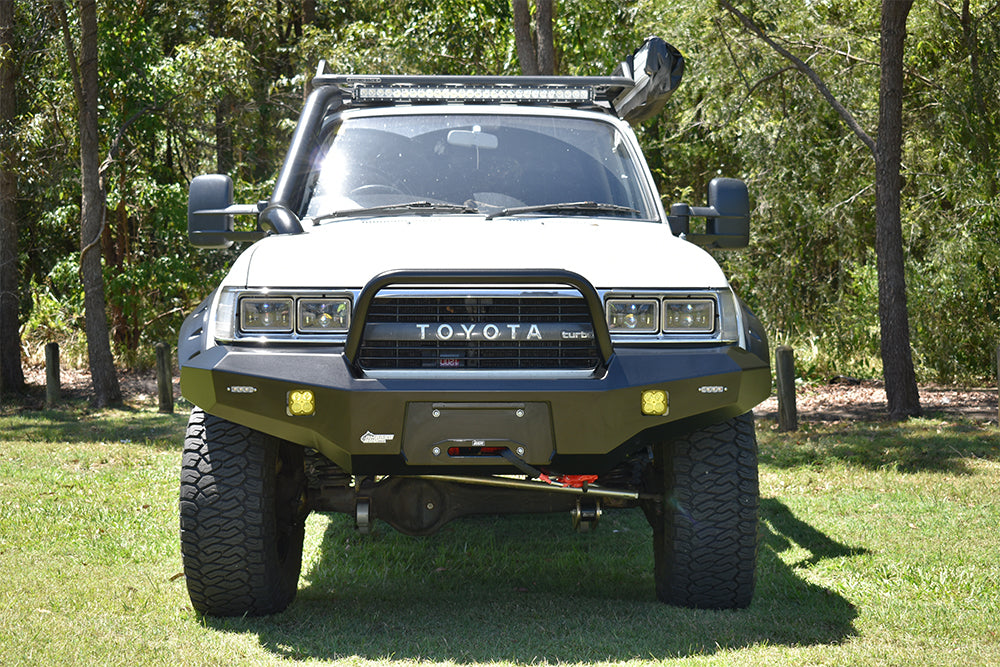 Toyota Landcruiser 80 Series Ambush Satin Black Single Hoop Bar, No Body Lift, Slimline Silver Fairlead