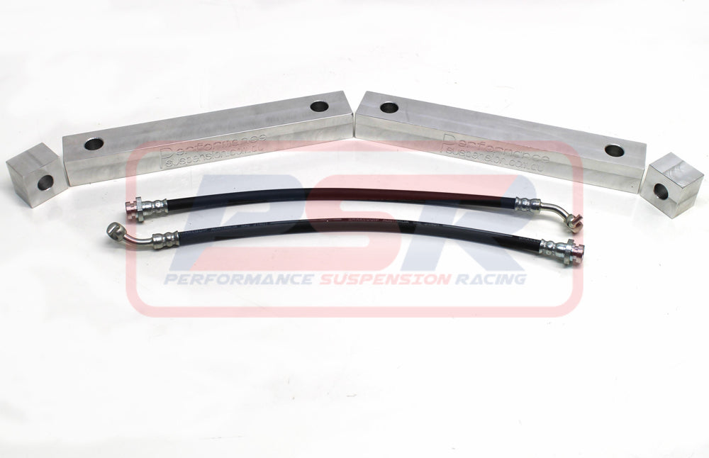 PSR offers a rear crossmember lift system which allows the Pathfinder to be lifted over 2". The rear suspension on this vehicle has very short control arms and there is no shock available to accept a larger than 2" lift. The kit includes CNC machined alloy blocks which bolts in-between the crossmember and the chassis and gives an extra 1.5" lift. This can be coupled with our front suspension products such as, strut spacers, extended ball joints and raised shocks and springs to achieve an overall 3-4" lift all round. Also this kit can be used on a standard height car if suffering from bad positive camber as a way to keep standard wheel alignment settings, as when using this spacer kit, the wheel alignment settings remain unchanged. Kit comes with four machined blocks, six bolts and extended brake lines. Pinion angle is not effected when installing this kit.