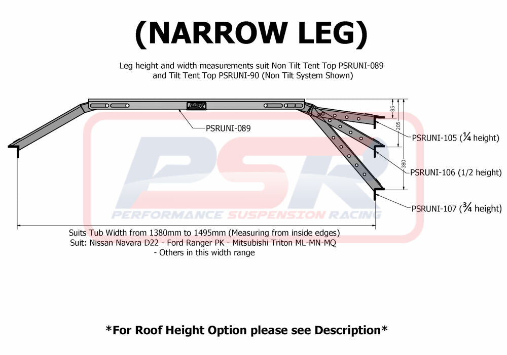 PSR has designed a Baja style Roof Top Tent mount to sit your Roof Top Tent over your tray. Suits ALL ute tubs between 1370mm and 1560mm tub width which is all your common cars, Hilux/Navara/Triton/Colorado/D-Max/Amarok/Ranger/BT-50 etc. Powder-coated Black.