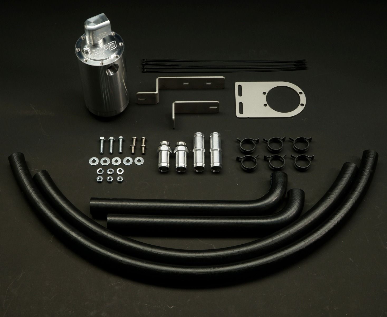 HPD’s oil catch can / oil separators come in universal and complete kits with all required stainless steel laser cut bracketry, correct size hose tail fitting, washable internal stainless mesh filters, cut to size oil resistant hosing, bolts, nuts, washer, spring clamps and installation instructions for each vehicle.